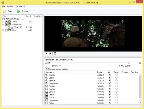 FluxDVD Encoder is used to encode Video-DVDs to the FluxDVD format. This allows keeping the full DVD functionality while reducing the size because more effective codecs are used.