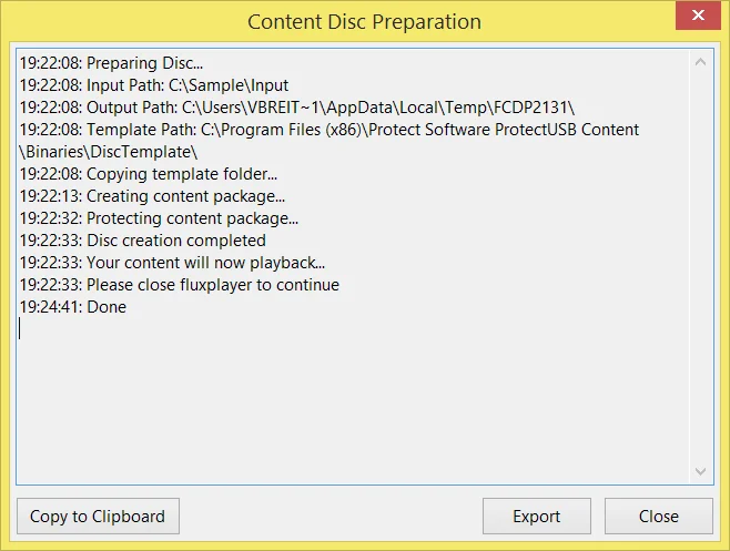 When the content is prepared and after you have closed FluxPlayer after reviewing the content, the window above is displayed.