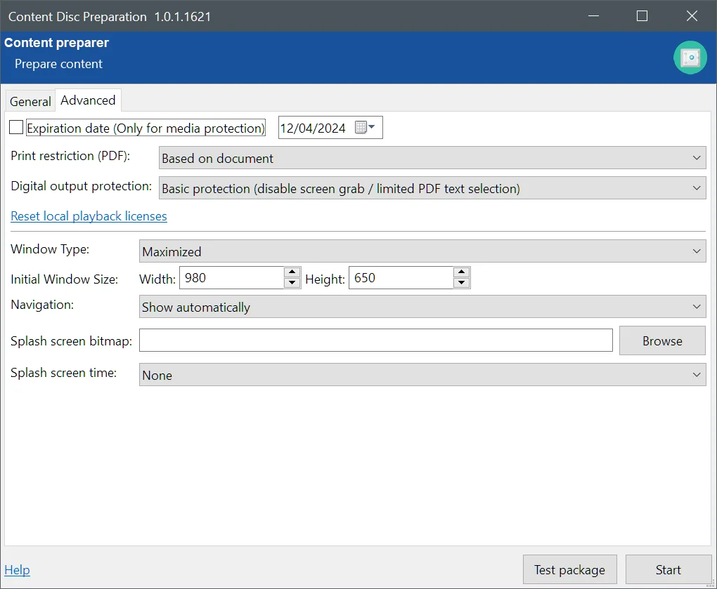 Before you start the process, you should use the "Test package" function to make sure your content behaves as it should. Once you click the button, the content will be built and displayed exactly the same way as it would from a USB stick.