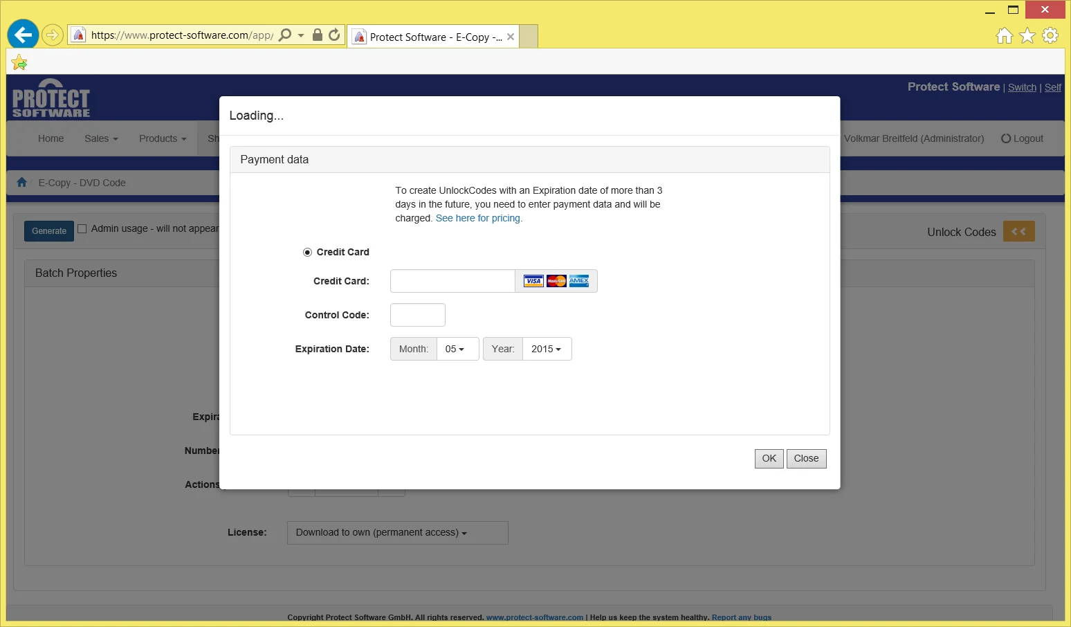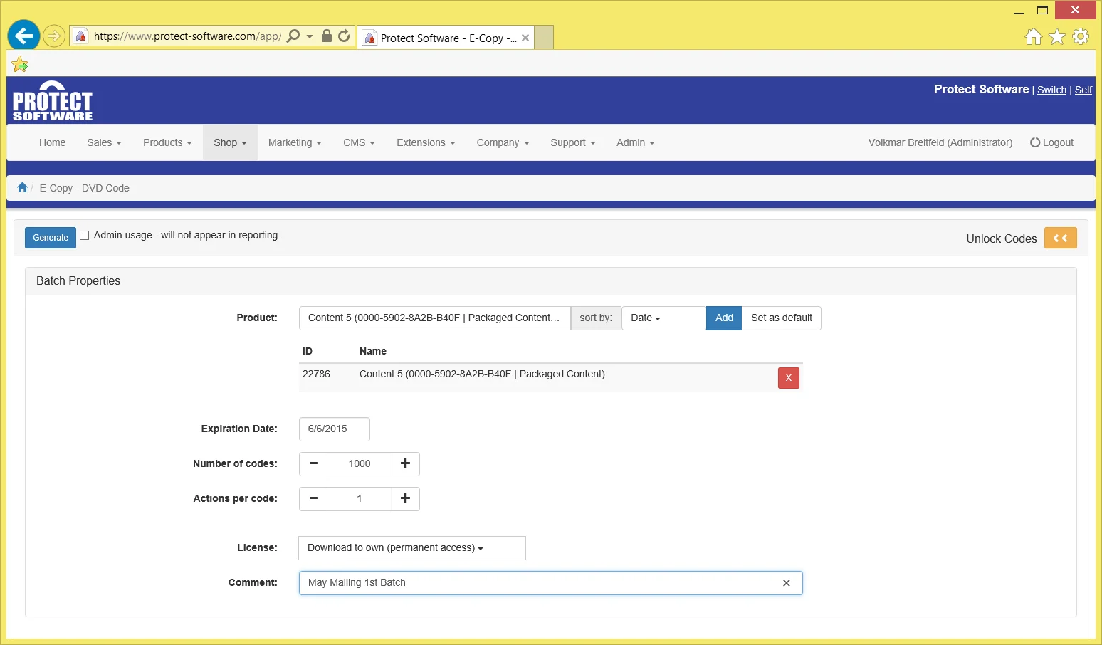 After login you are automatically located in the UnlockCode section of the Protect Software website. It lists the codes you have already created and you can create new codes by clicking the “Create UnlockCodes” button.