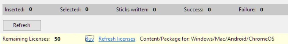 This area lists all connected USB sticks. You can check the sticks you want to use for the copy/license operation. The USB stick(s) must be pre-formatted and writable. If you add additional USB sticks during the program is running, you need to click the Refresh button to display the newly added USB stick(s). |