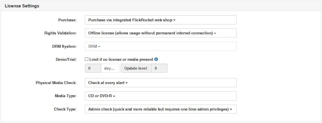 Use these settings to define the behaviour of the excutable/app such as whether or not it can be purchased, if a media is validated, if a demo/trial version is offered, etc.