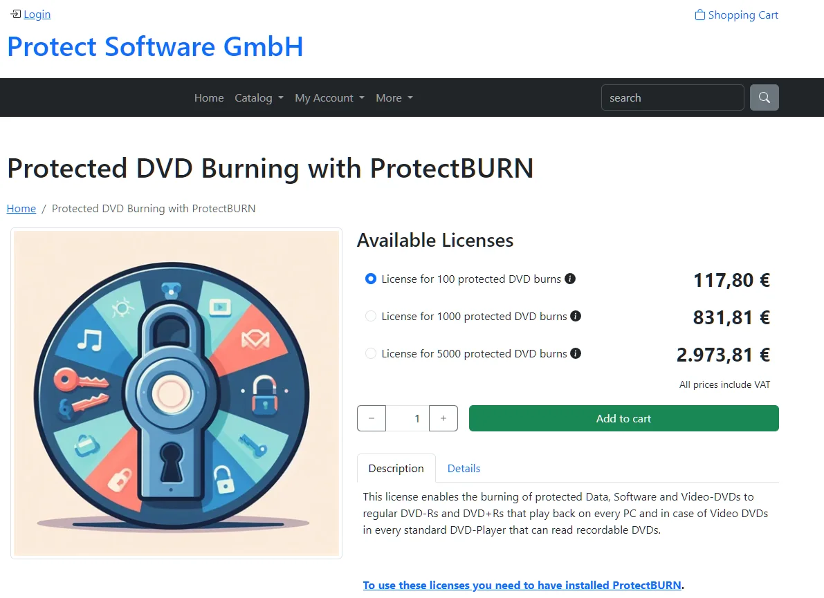 Important! One “burn license” is valid for exactly one burn. This is independent of the protected DVD. So, with 10 burn licenses, you can protect 10 DVD-Rs of one title but you can also use them for 10 different titles with one protected DVD-R each.