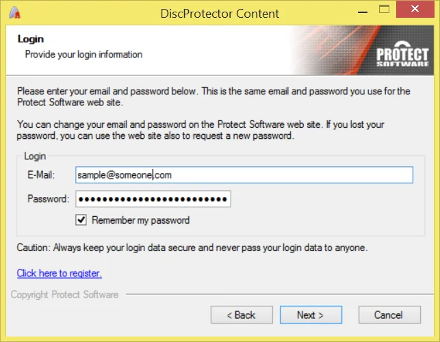 On the next page, you need to enter the email address and password of your Protect Software Movie Publisher account. If the computer is only used by authorized personnel, you might want to mark the “Remember my password” checkbox.