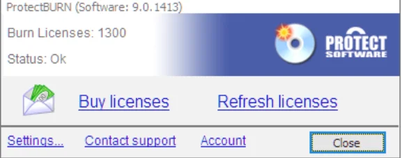 You can purchase burn licenses from the Protect Software Burn Licenses Web shop. To get there select the “Buy Licenses” option from the Protect BURN Tray Application.