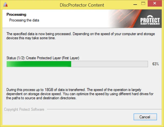 DiscProtector will now process the data and create the protected output ISO image. Depending on the speed of the hard drives/network connections this will take some time because up to 15 GB of data is transferred.